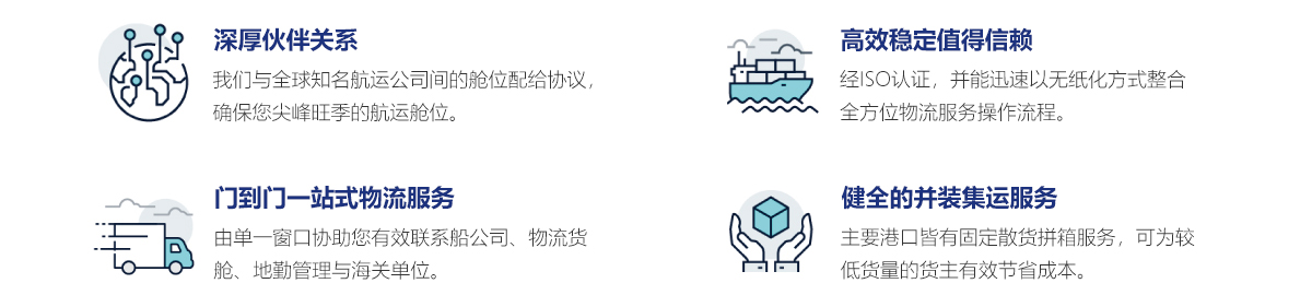 我司經(jīng)營華南、華東、華中、華北海運(yùn)訂艙服務(wù),為多家船公司的一級訂艙代理。優(yōu)勢航線涵蓋東南亞、中東、非洲、紅海、歐美等地。同時(shí),我司積極發(fā)展全方位報(bào)關(guān)、倉儲及物流派送服務(wù)。專業(yè)的服務(wù)團(tuán)隊(duì)、親切的個(gè)性化服務(wù),贏得了國內(nèi)外客戶的一致肯定。